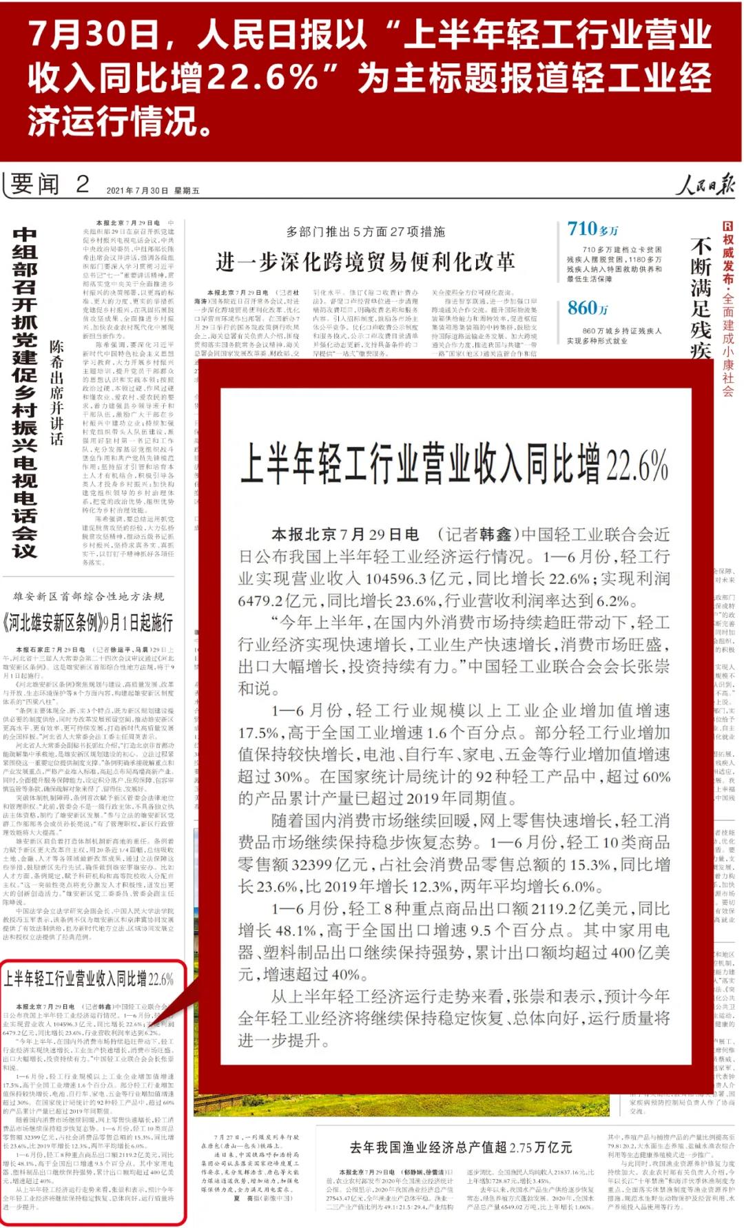人民日报:上半年轻工行业营业收入同比增22.6%