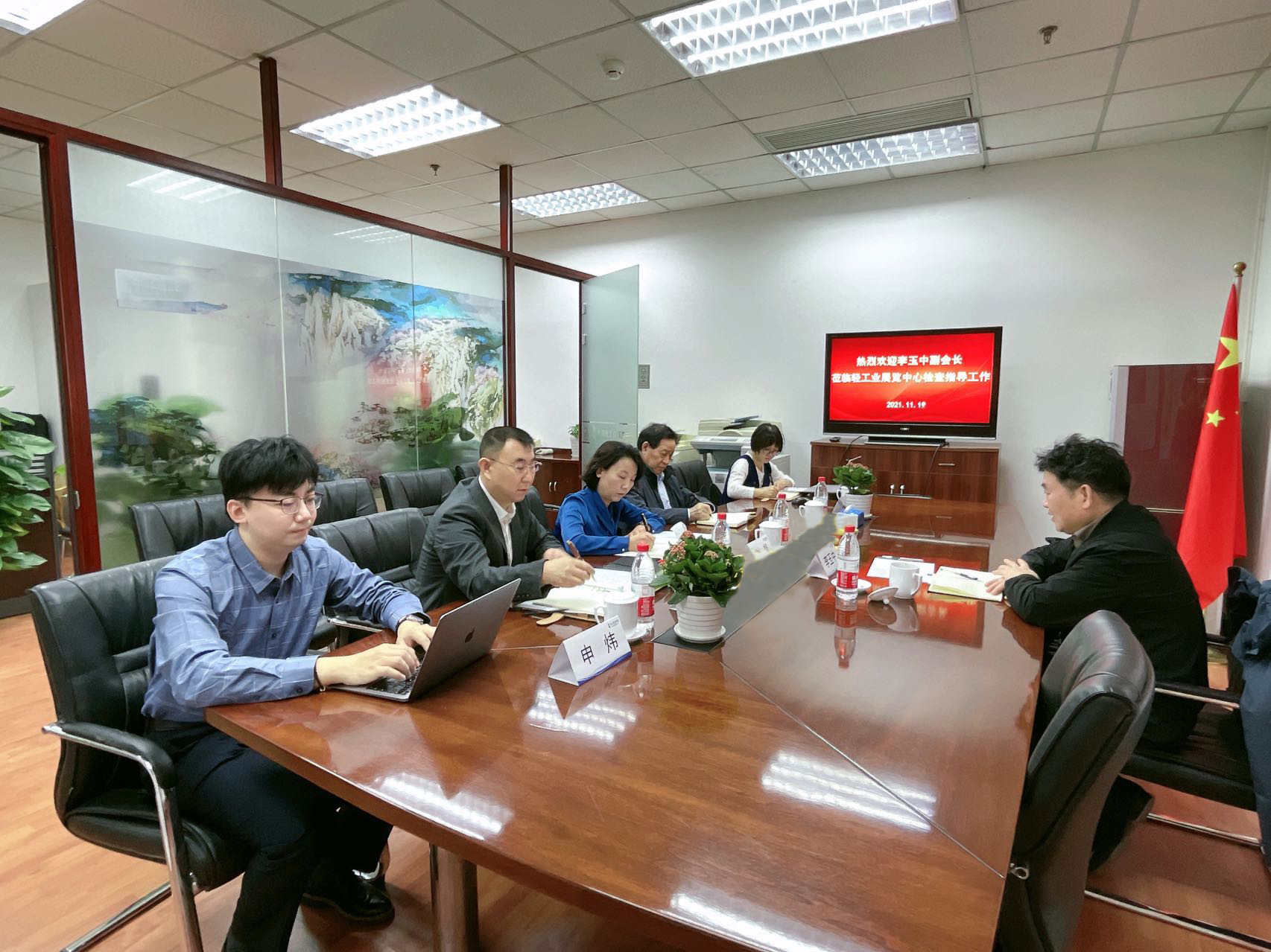 2021年11月19日11月19日上午,中国轻工业联合会李玉中副会长到轻工业展览中心调研指导工作并召开座谈会,展览中心主任谢帆、副主任方新堂,以及办公室(党办)、展览工作处、信息培训处等部分处级干部参加座谈。
